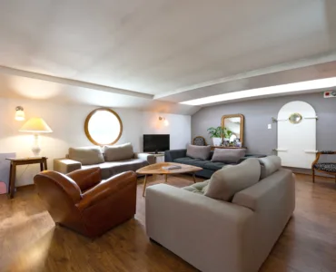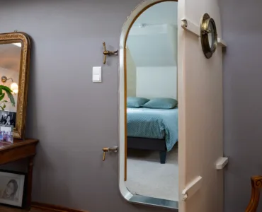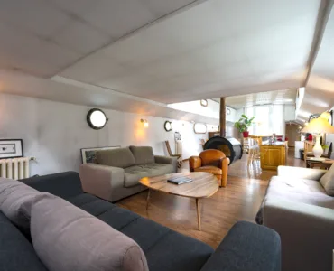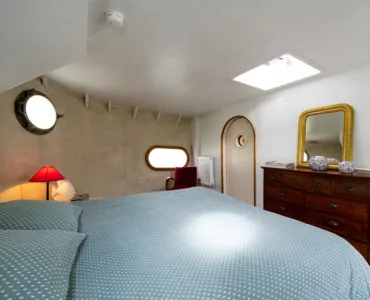 L’appartement du marinier, entièrement rénové en 2021, offre un refuge intime de 24 m². Parfait pour accueillir amis et famille ou pour aménager un espace de travail, cet appartement comprend une timonerie vitrée avec une partie haute démontable. La cuisine et le coin repas sont équipés de fenêtres coulissantes, de placards et d’un buffet intégrés d’origine, ajoutant une touche d’authenticité. La chambre confortable dispose d’une armoire intégrée, d’une cabine de douche et de toilettes, avec hublots et une fenêtre de toit pour une luminosité naturelle.