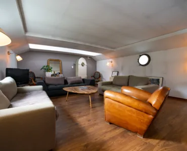 L’appartement principal, d’une superficie généreuse de 185 m², s’ouvre sur un vaste espace de vie de 140 m². Un escalier central vous conduit vers un séjour lumineux avec une cuisine ouverte entièrement équipée, un espace salle à manger et un salon spacieux. La chambre principale de 17 m² est idéale pour un repos bien mérité, tandis qu’une cheminée suspendue fonctionnelle apporte une touche de charme et de confort pour les soirées d’hiver. Une salle de douche moderne, des toilettes séparées et une buanderie pratique avec hublots et placards intégrés complètent cet espace.