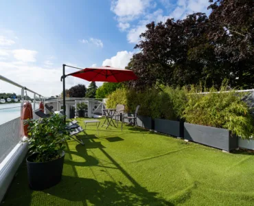L’extérieur de la péniche est tout aussi impressionnant avec une magnifique terrasse de 40 m², idéale pour des moments de détente en plein air. Une terrasse centrale de 13 m² offre un espace parfait pour installer un spa, tandis qu’une terrasse de 17 m² sur le peak arrière complète l’appartement du marinier, offrant encore plus de possibilités pour profiter des beaux jours.