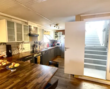 L’entrée se fait par la grande terrasse partiellement couverte, de 22x4m soit 88 m2 entièrement ouverte sur le fleuve. Un escalier à gauche vous emmène directement dans l’habitation principale et dans la vaste salle à vivre et la cuisine ouverte.