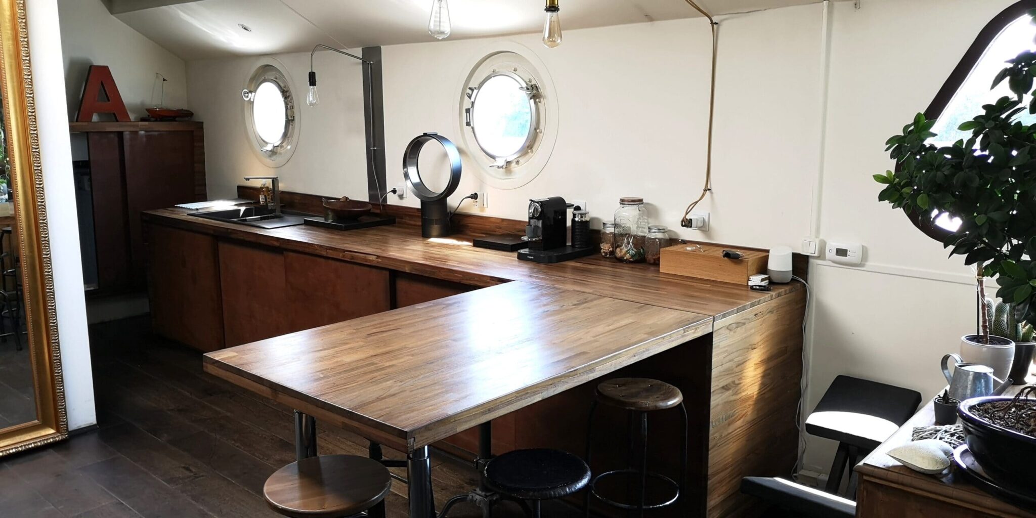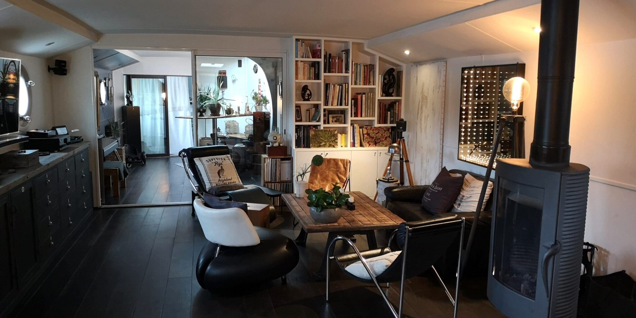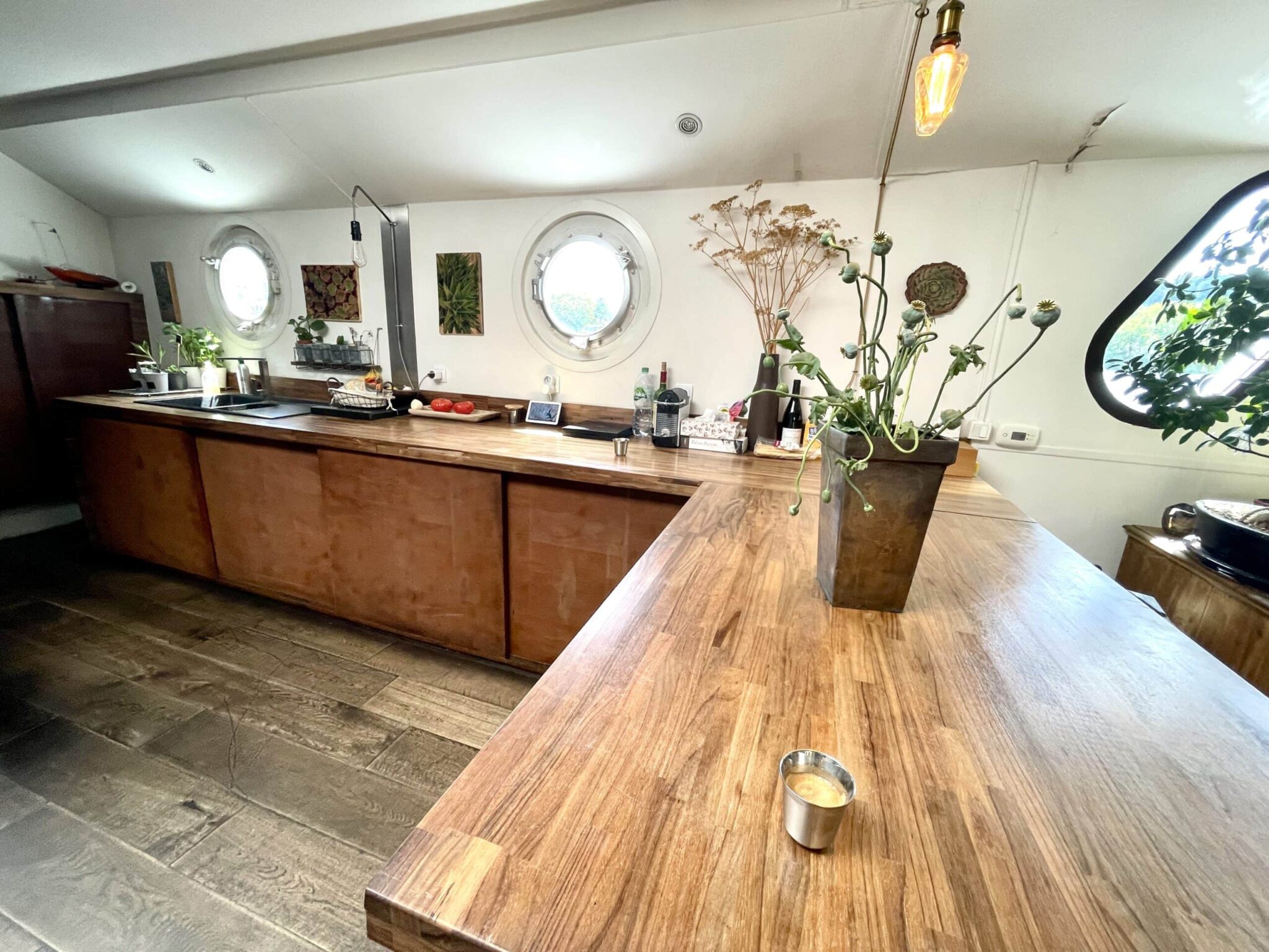 Une péniche aux charmes discrets et familiale de 180 m2 et 3 chambres sur les bords de Seine, à Boulogne Billancourt, dans les Hauts de Seine. A 10 minutes de Paris.